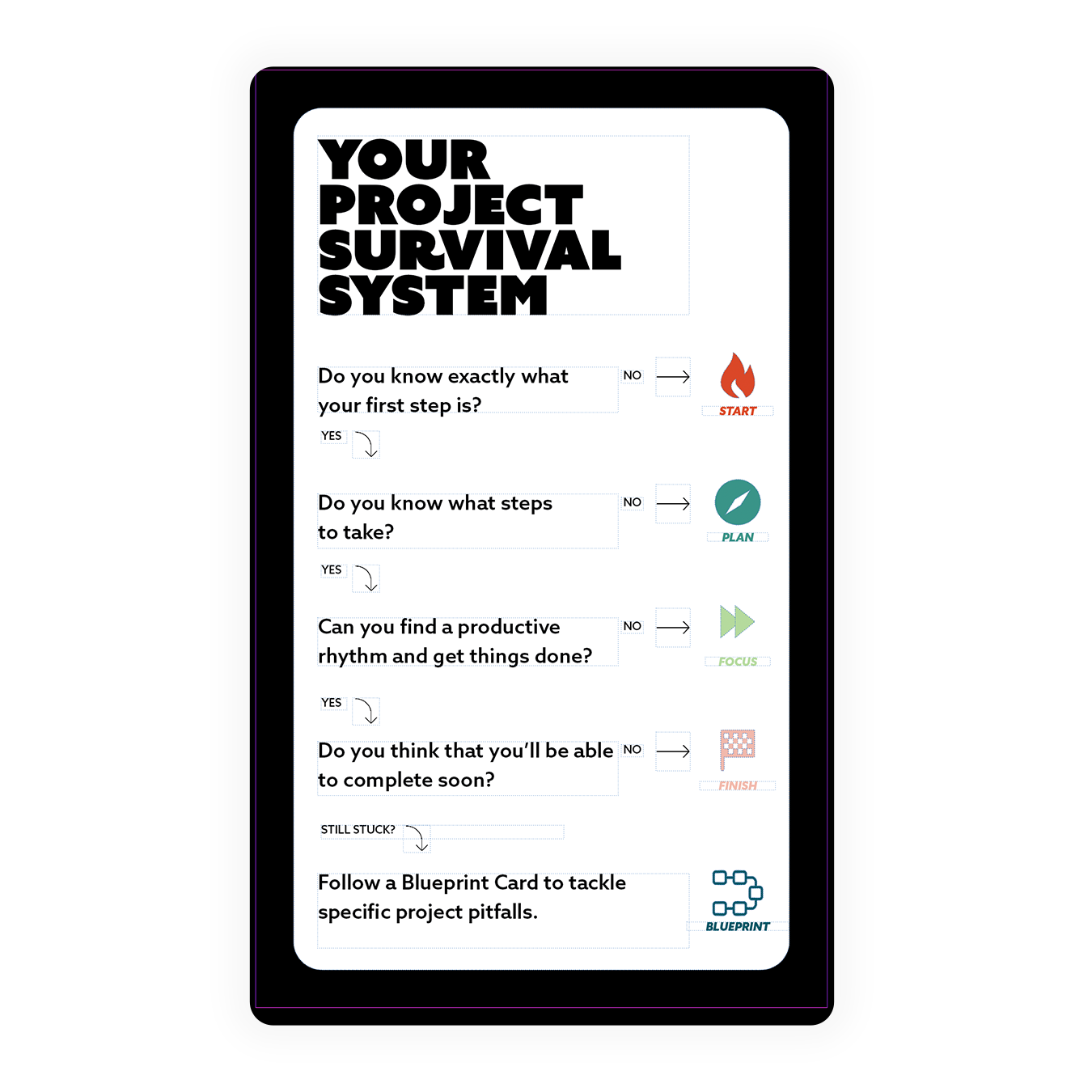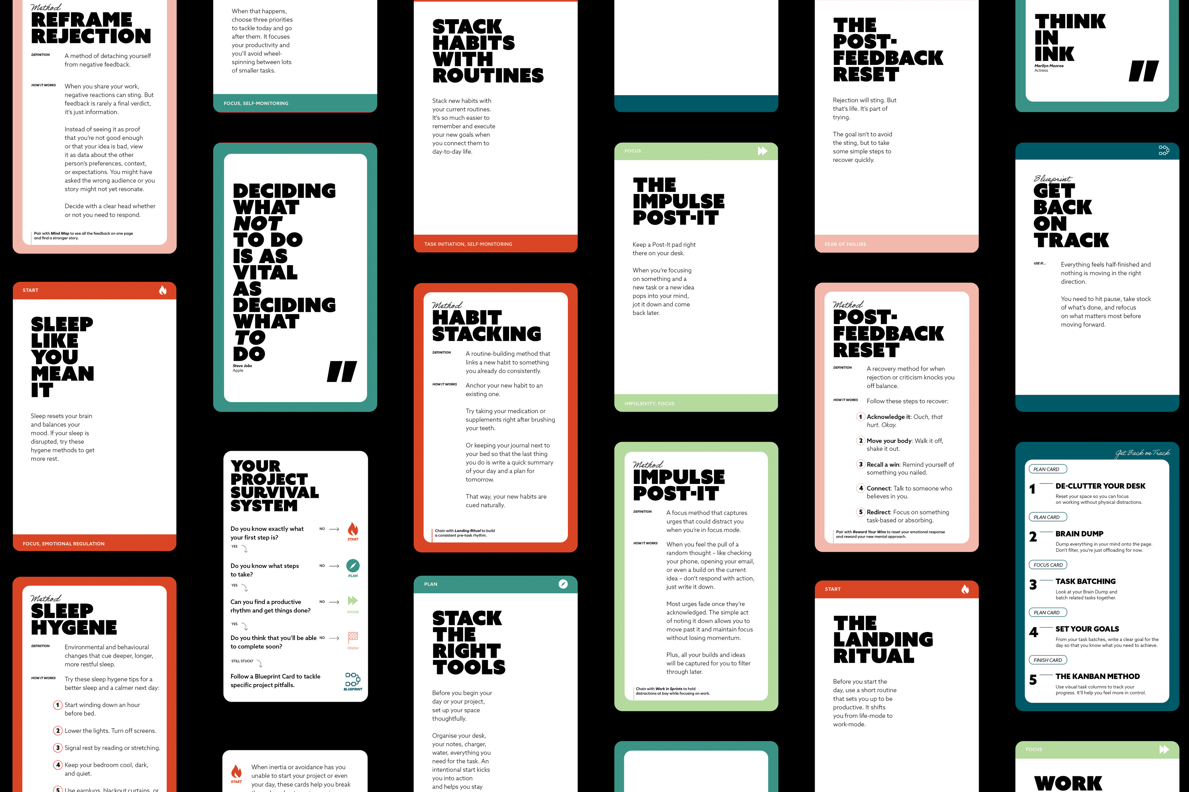 Each deck contains 40 bombproof survival strategies. Draw a card when you’re stuck and, over time, build your own system.